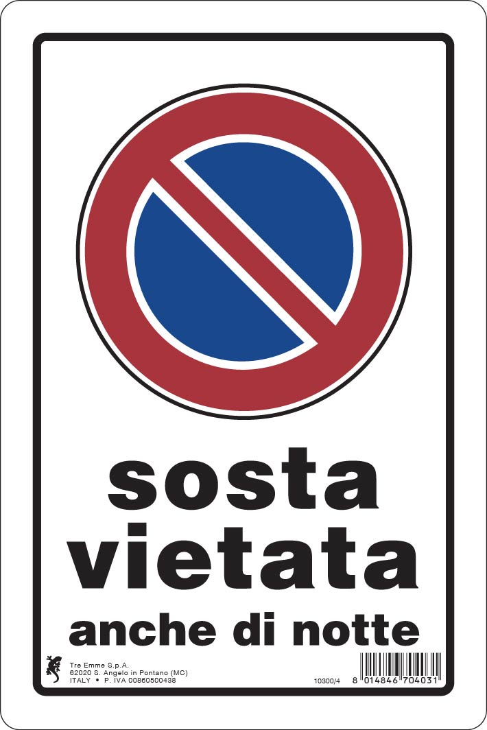 Cartello sosta vietata anche di notte 30×20 in plastica